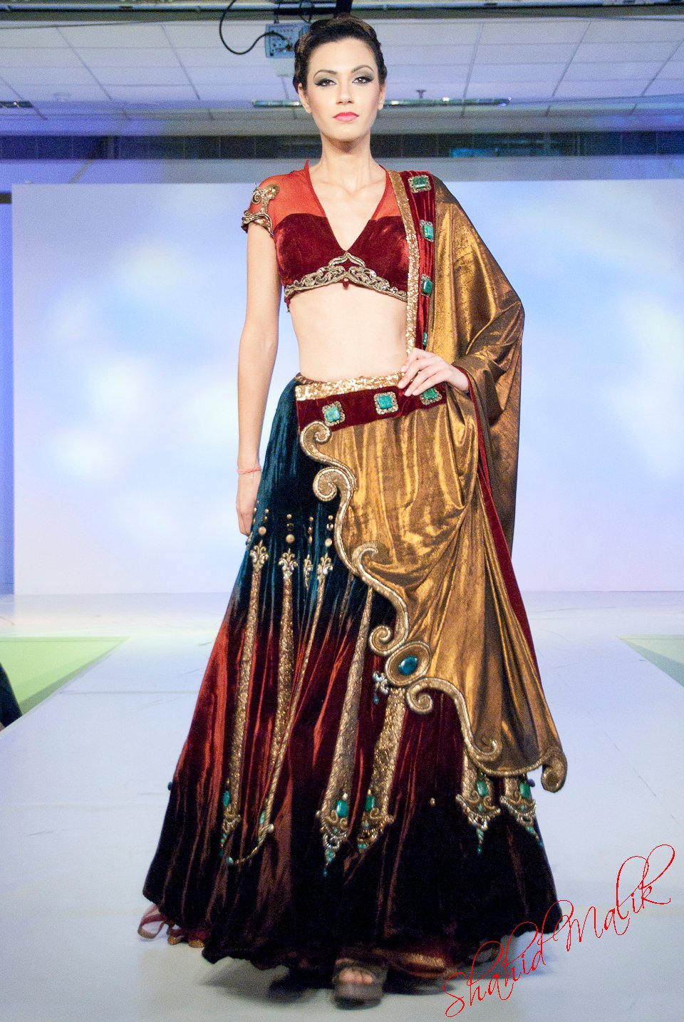 This lehnga choli by the designer reflecting the cultural sence of designer. Designer beautifully moulded cultural outfit into stylish modern design in this fashion show. V shaped blouse with short sleeves looking great with similar sort of lehnga style. Lehnga is in casual style nourished with modern sence of designing and embroidery.